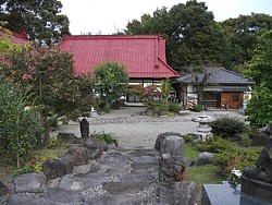 左&中: 本堂屋根は葺き替えられているが内側は萱葺きと思われる。左は山門の内側から、中は敷地左奥の信義廟所手前から撮影したもの。