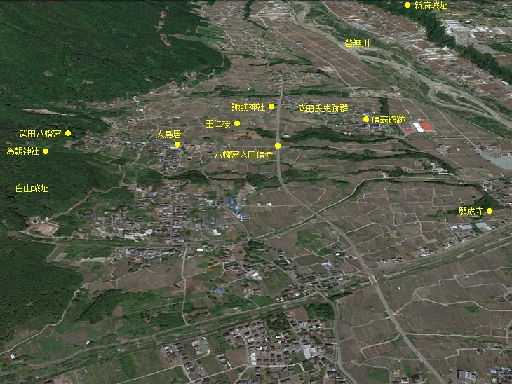 武田八幡宮から釜無川まで、武田一族の源流となった「武田の郷」の鳥瞰
