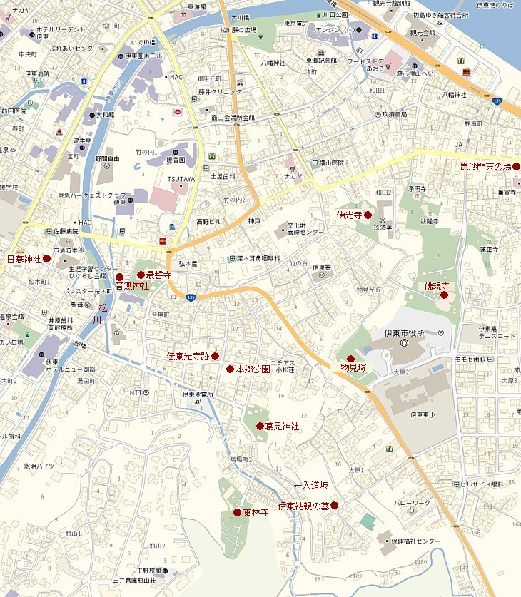 伊東 東林寺周辺の史蹟地図。松川から葛見神社や東林寺まで平坦、東側は高台となる。