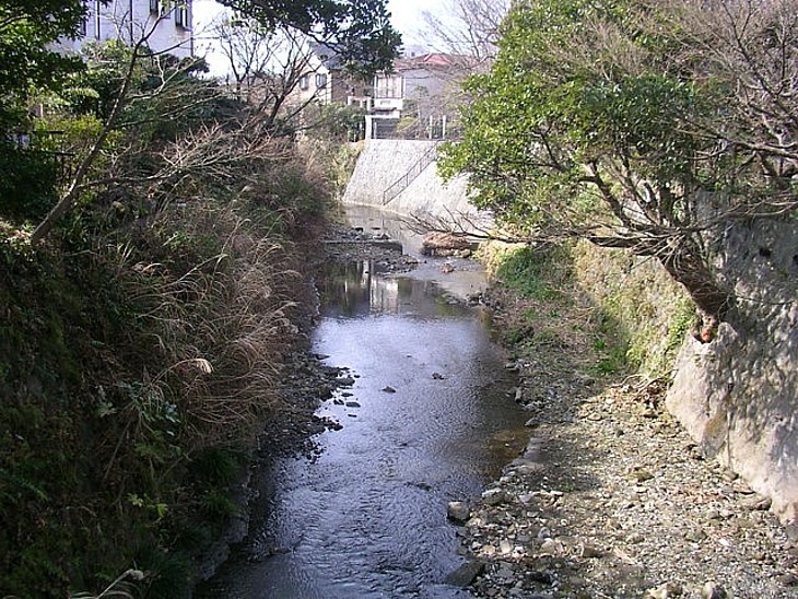 東勝寺橋から下流を撮影。比企ヶ谷方向。滑川右岸を日蓮辻説法跡経由で妙本寺まで1km弱。