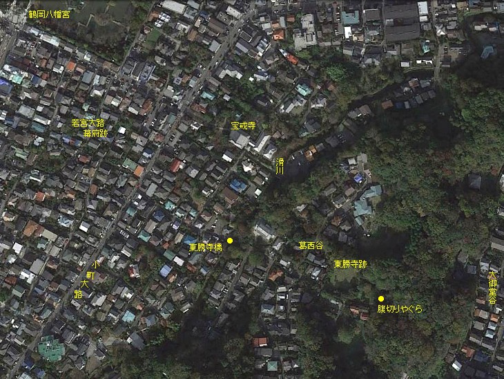 東勝寺と寶戒寺中心の鳥瞰図。勝長寿院があった大御堂ヶ谷に下る道は通じていない。