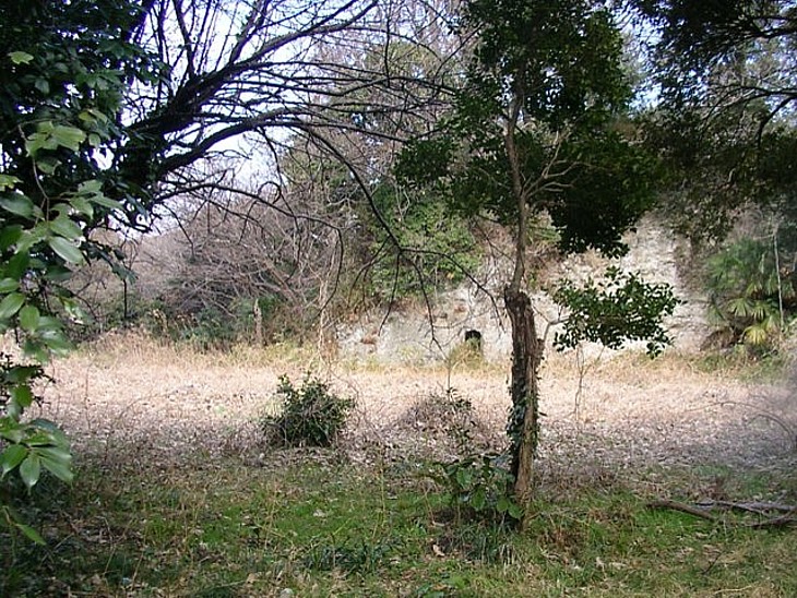 荒地状態の東勝寺跡。奥の崖に数ヶ所のやぐら、発掘調査で三つ鱗紋の瓦や石畳・石垣が出土した。