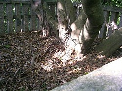 右: いちおう墳頂まで登って見た。石柵の内側には太い樹木の根元に枯葉が積もっているだけで墓石の類は置かれていない。