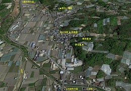 左: 門前に架る周辺絵地図。東の山と西の石川に挟まれた要害の地で、1km南に飛鳥京と難波を結ぶ竹内(たけのうち)街道が東西に走る。