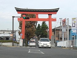 左: 東海道(国道一号)に面した一の鳥居。ここ鳥居戸橋交差点から本殿まで約900mの参道が真っ直ぐに延びる。昔日の「八丁松並木」だ。