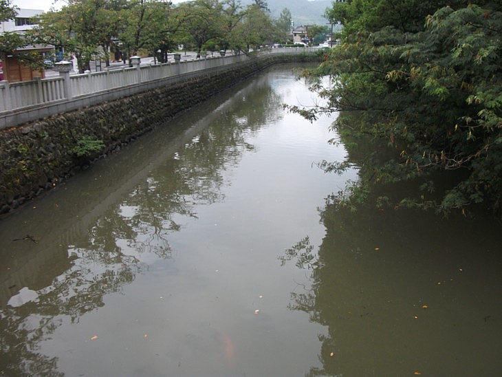 左側、巾15mほどの水濠。南側と西側と東側の一部が水濠で、北と東には土塁と空濠が残っている。