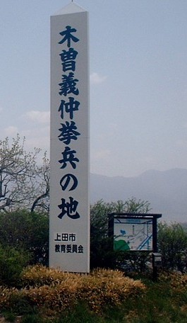 海野宿の東側、駐車場に近い千曲川畔の木曽義仲挙兵の地(上田市教育委員会建立)の塔。