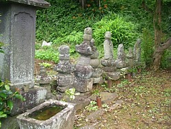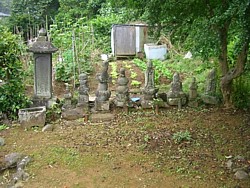 上: 残されている墓石は5柱、他に石地蔵や僧形の坐像などが並ぶ。これも1450年前後の津波で散逸後に回収された墓石の一部だろうか。