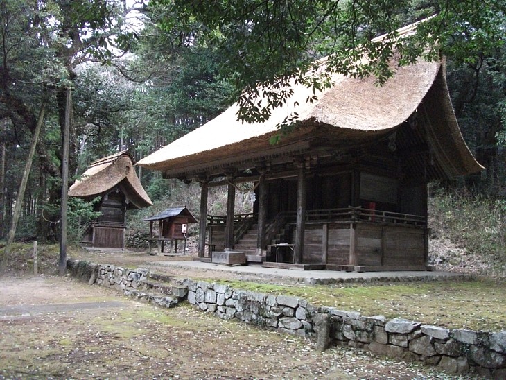 石段上の平場に建つ綱神社(手前)と大倉神社(綱神社の摂社)、共に国の重要文化財。