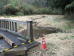 上: 綱神社参道の鳥居左手に浄土庭園の痕跡があり、鶴亀の池の一部が確認できる。足利義兼が隠居所とした樺崎寺(別窓)と同様に、