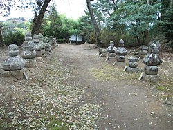 左: 廟所の最も奥を背にして右側部分を。南側(左)から、15基・7基・2基の五輪塔や板碑が並んでいる。