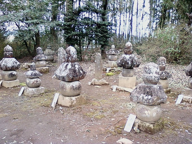 廟所の最も奥から右手の方向を。南側から15基・7基・2基の五輪塔や板碑が並ぶ。