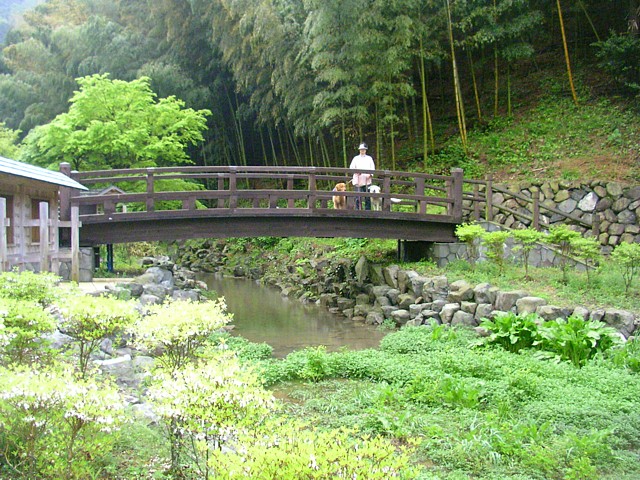 木橋の上で記念撮影。公園は川沿いに芝生も造られ、古道の入口近くまで約500mの細長いレイアウトだ。