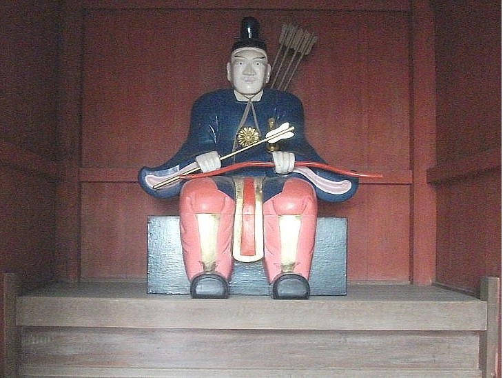 朱塗りの神門の両袖に弓矢を持った武者像を納めているが由来は判らない。右袖には若年の武者。