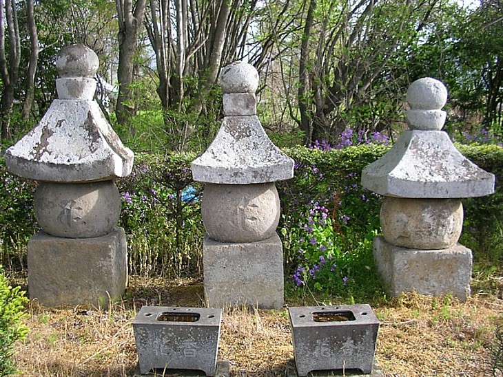 大きな五輪塔の中央が義定・左が鎌倉で殺された嫡男義資、右が二男義季の墓標。