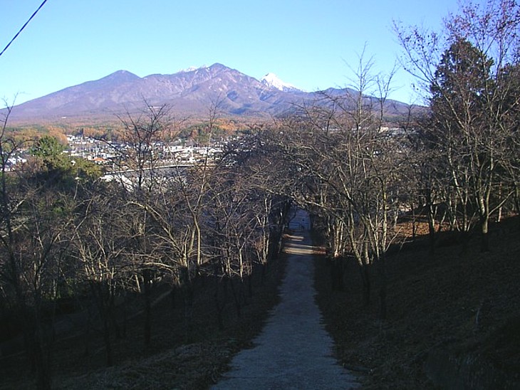 西の帯郭から大手虎口を見下ろす。冠雪の八ヶ岳が美しい。