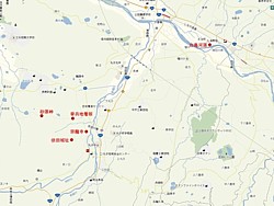 左: 依田城址から白鳥河原(海野)までの地図。依田川沿いに国道152号を南下すると約10kmで中山道(中世の東山道)長久保宿に至る。