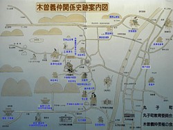 中: 丸子町周辺の義仲関連遺蹟の地図。「巴御前お歯黒の池」など眉唾物も多いが、依田城址周辺や依田実信が居館を義仲に譲った高築地館跡