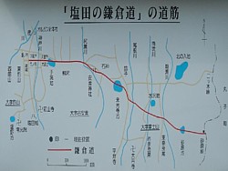 右: 丸子町と「信州の鎌倉」として知られる塩田平の別所温泉を結ぶ鎌倉道案内図。宗龍寺から高築地館跡まで1km強、更に砂原峠まで1.5km、