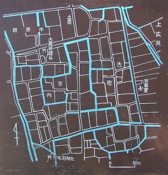 城助職の軍備を整えた横田城の遺構地図。青の帯が土塁と水濠の痕跡をを表示している。