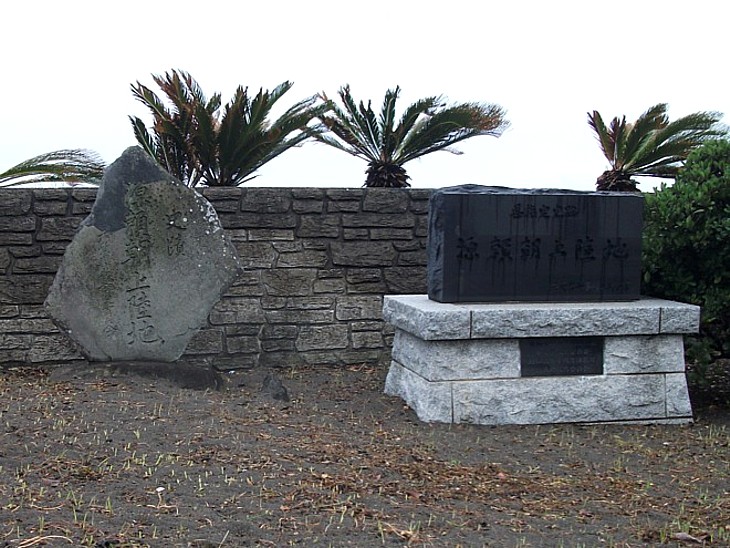 海辺の民宿が続く駐車場の一角に町の教育委員会と千葉県が建てた頼朝上陸地の碑が二つ。