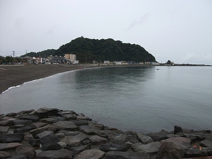 南側の勝山海岸越しに大黒山を撮影。天守閣の形をした頂上展望台は安西氏の出城跡らしい。