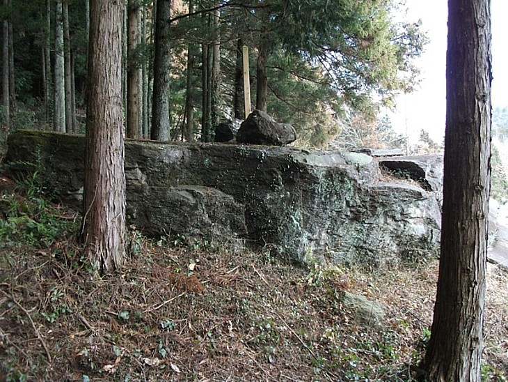 すぐ先で藪の中に消えて行く古道の横、徳永川を見おろす斜面に突き出した平らな頼朝石。