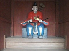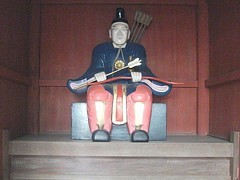 左: こちらは若い武者の像。神門の両袖に老若の武者像を配しているのを見たのは、浅利与一義成を祀った 諏訪神社の中段と、那須与一を祀った