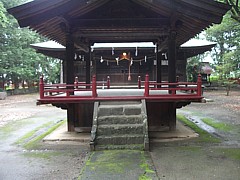 右: 神楽殿も本殿と同時期の造営。ちょっと変った日程の例大祭(二月の第一日曜)には記紀神話に基づいた「太太神楽」を演じる。