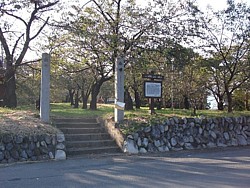 中: 大門碑林公園 と ひらしお源氏の館 前の駐車場から源氏館跡の方向(中央に見える森)を。館の跡から笛吹川までの標高差は約40m。