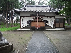 中: 賽銭箱と鈴がなければ田舎の集会場に見える拝殿。戦前までは7月と9月に通し矢の神事が行われていた、と伝わる毎年7月末には