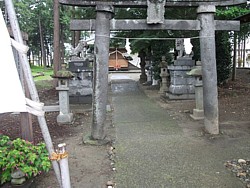 公民館まで含めると70m四方の広い神域となる。かつては墳墓 (実際には古墳の跡) のある左の住宅街までが境内だったと思われ、社殿の正面 (南) には濠、
