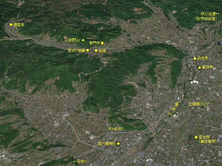 甲府盆地の北東部に点在する安田義定の史跡群、洞雲寺から雲光寺までの鳥瞰図。