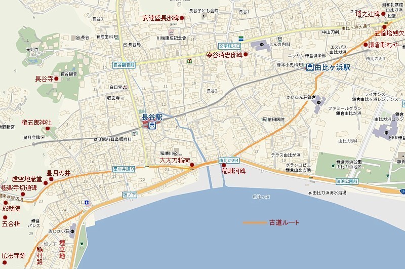 薄茶色の細線が鎌倉中央部と極楽寺坂を結ぶ古道の推定ルート。塔之辻の東は新道と重複する。