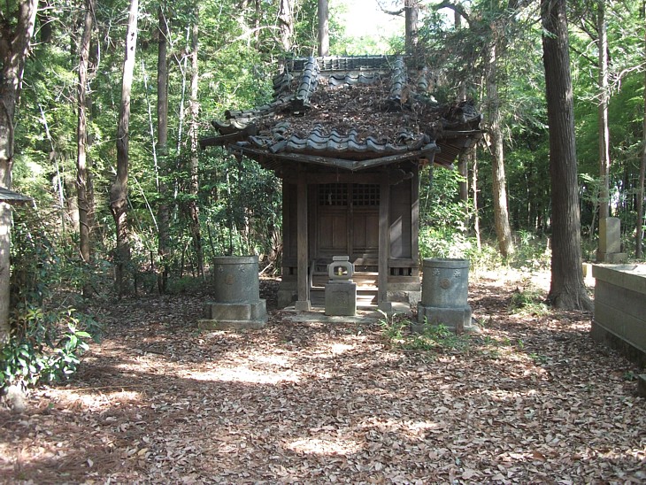 半ば腐って瓦も半ば落ちている立木之地蔵尊。参道入口の石柱には「栗橋家鎮守」と彫ってある。