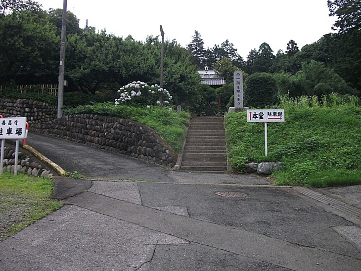 中央の凹地から参道へ、更に石畳を経て山門への石段が続く。左右に広い駐車場あり。