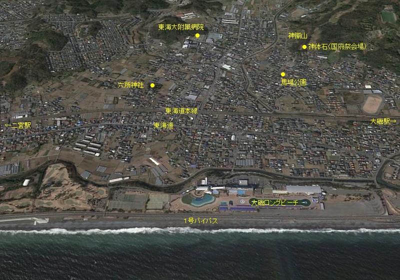 大磯プリンス上空から見た国府本郷。六所神社と神揃山の距離は直線で約1km。