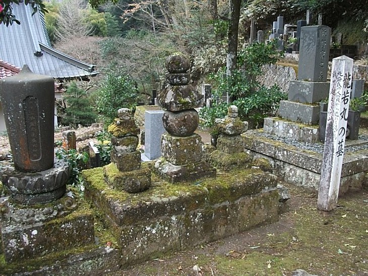 本堂裏、北条氏康に敗れた関東管領上杉憲政の子・龍若丸(中央)と家臣の墓。