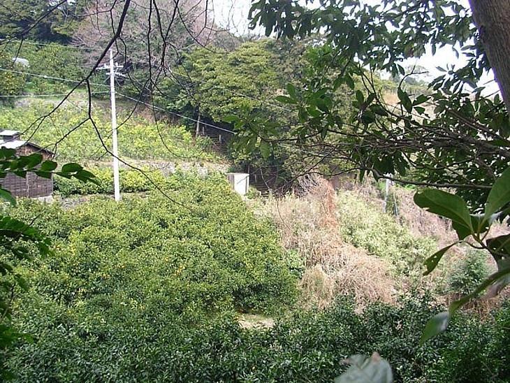 文三堂(吾妻鏡では豊三)の石段下から「ねじり畑」越しに霊社に登る参道方向を。