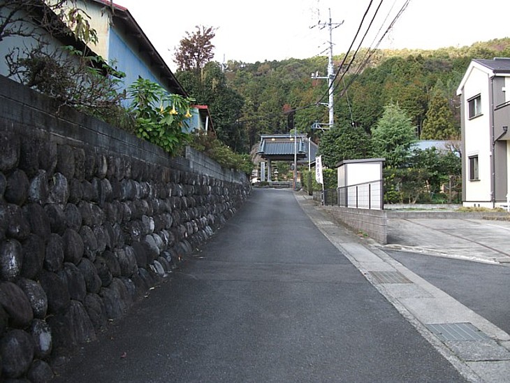 金剛寺の参道と山門。首塚から直線で約400m、実朝の坐像と位牌を保存している。