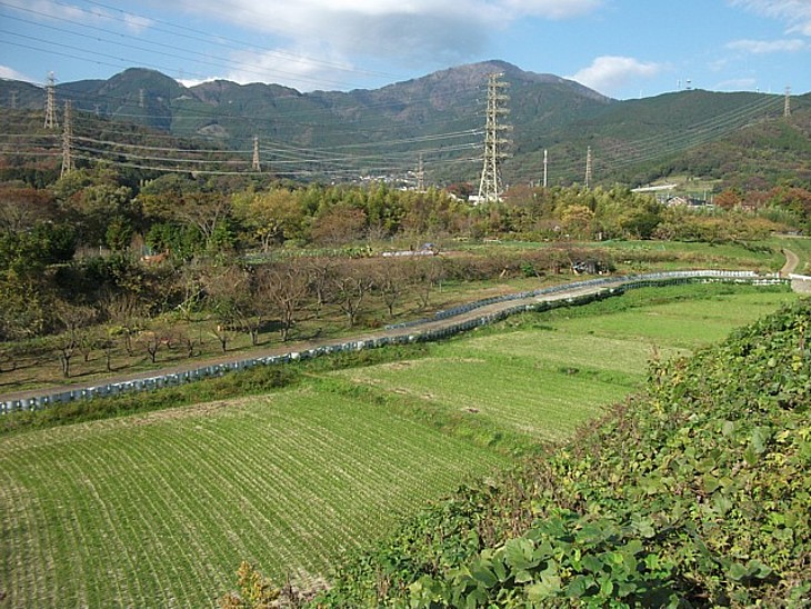 鳥瞰図@から見た波多野城址。鉄塔の背景に阿夫利神社で有名な大山が聳えている。