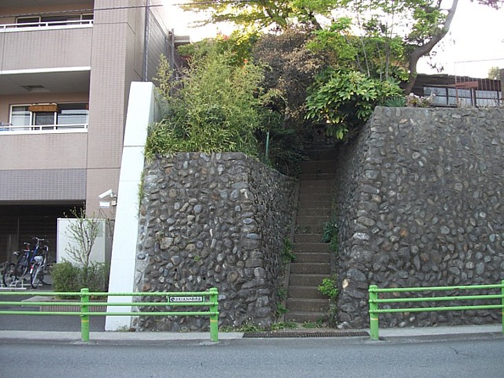 旧街道沿いの300mほど南の石垣。急傾斜の石段を登った平場に合戦戦没者の五輪塔が残っている。
