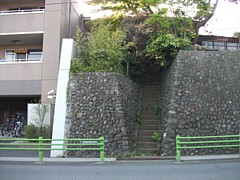 中&右: 旧街道に戻って南へ(つまり関戸橋を背にして)300mほど歩くと右側のマンション手前の石垣に急傾斜の石段が見える。古い民家の裏庭に