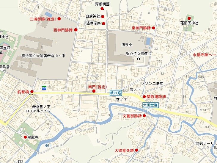 六浦道岐れ道周辺。北西は二階堂大路、南側は文覚邸跡を経て勝長寿院跡に続く。