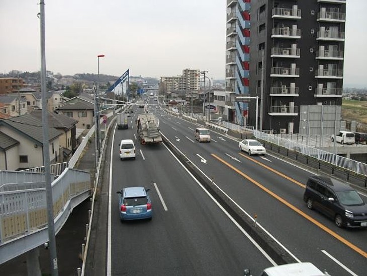 国道16号のイオン前から八王子方向を。アルペン(三角形)の筋向いが清水八幡、100m先にも歩道橋がある。
