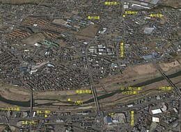 右:清水義高が討たれた入間川の鳥瞰 画像をクリック→拡大表示