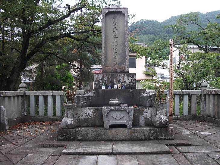 武田信玄の墓碑。正面に「法性院大僧正機山信玄之墓」とある。香台にはもちろん武田菱だ。