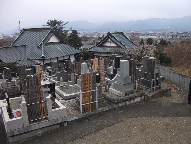 南に傾斜する法蓮寺墓地。現在は日蓮宗、満劫が没した正治元年には天台宗だった。