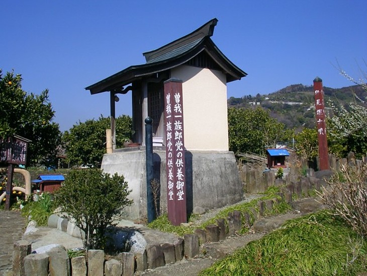 祐信館跡の一族郎党供養堂。350年後の子孫信正が後北条氏に叛き、攻められて360余人が自決した。