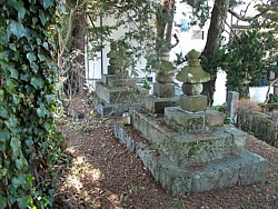 中: 墓石は左から弟の五郎時致と兄の十郎祐成、少し離れて満江と曽我祐信。満江の墓は法蓮寺の自然石が本物だろうし、兄弟の墓は多すぎて本物と